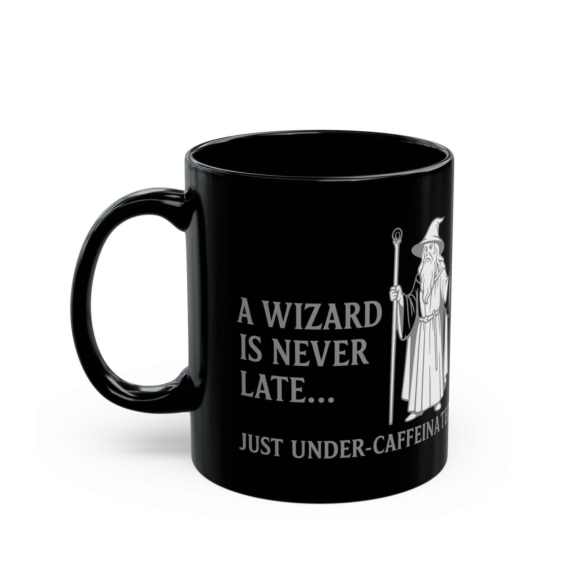 Introducing the 'A Wizard is Never Late, Just Under-Caffeinated' mug, a whimsical addition to your kitchen decor. This stylish black mug is perfect for coffee lovers who appreciate a touch of magic in their morning routine.